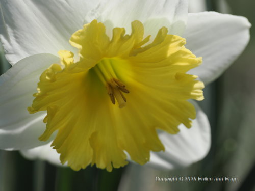 A large field of trumpet daffodils is in full bloom at the arboretum. It is quite a spectacular sight. Here are a couple of close-up shots. I also have some growing in my own backyard. They have returned cheerfully after a long winter. Mine, as I recently learned, is the Narcissus ‘Dutch Master’, with bright yellow petals and a matching yellow trumpet. In contrast, the variety shown here has a lemon-yellow center and white petals. It is called Narcissus ‘Holland Sensation’.