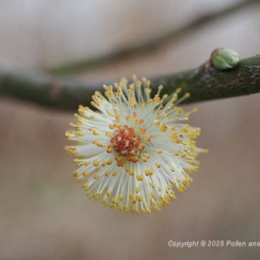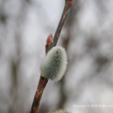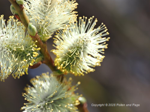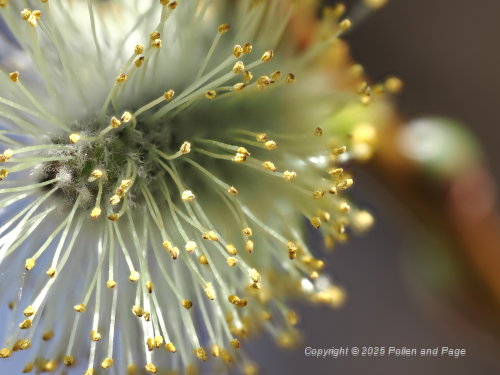 Pussy willow is a very common tree in my neighborhood and throughout North America. While it looks graceful all year round with its long and flowy branches, I find it to be the most spectacular looking in spring with its explosion of flowering catkins. If you have never heard of the term catkin, I would describe its appearance as an elliptical fluff ball with feathery spikes supercharged with yellow pollen. You may have seen willow branches with silvery buds that are used in flower arrangements, those hairy looking nodes when in bloom would turn into a catkin. There are male and female catkins. The male catkins produce pollens and the female catkins have ovules that receive the pollens. Interestingly, some willow trees such as those in the Salix genus are dioecious, meaning male and female catkins appear on separate trees. Most catkins are not long-lived and may last for only days in spring. I was delighted that I captured the below shots on two separate days and from two different trees.