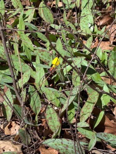 Just when I was about to leave the arboretum, I stumbled upon this shade loving plant tucked off the side of the trail—Erythronium americanum, the trout lily. What first caught my eye were its beautifully mottled leaves, patterned with purplish spots. I later learned that’s where the name ‘trout lily’ comes from, the markings resemble the speckled skin of a trout. This spring ephemeral is also said to be edible and can be used in salads. I couldn’t get very close to it, partly because it was growing in an awkward spot, and partly because it was swarmed with flies! So I snapped a quick photo from a distance. Next time, I’ll try to get a better shot of this fascinating little flower with bright yellow petals.